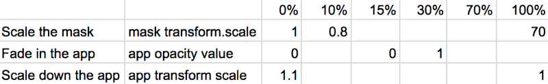 While the mask is scaling up, we fade in the opacity of the app layer, showing the app and hiding the solid white layer behind it. To finish the effect, we start the app layer at a scale > 1, and scale it down to 1 as the animation is ending. We then hide the non-app layers as they will never be seen again.